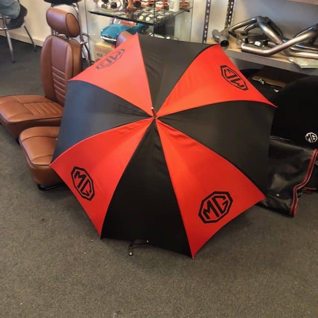 Joli grand parapluie en noir/rouge avec logo MG et poignée en bois.